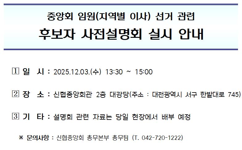 중앙회 임원(지역별 이사) 선거 관련 후보자 사전설명회 실시 안내