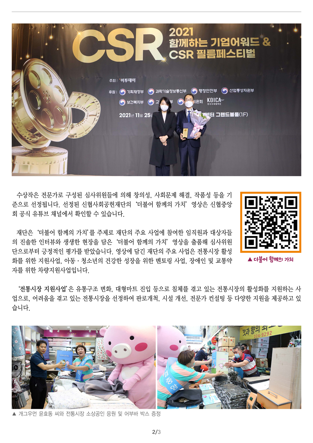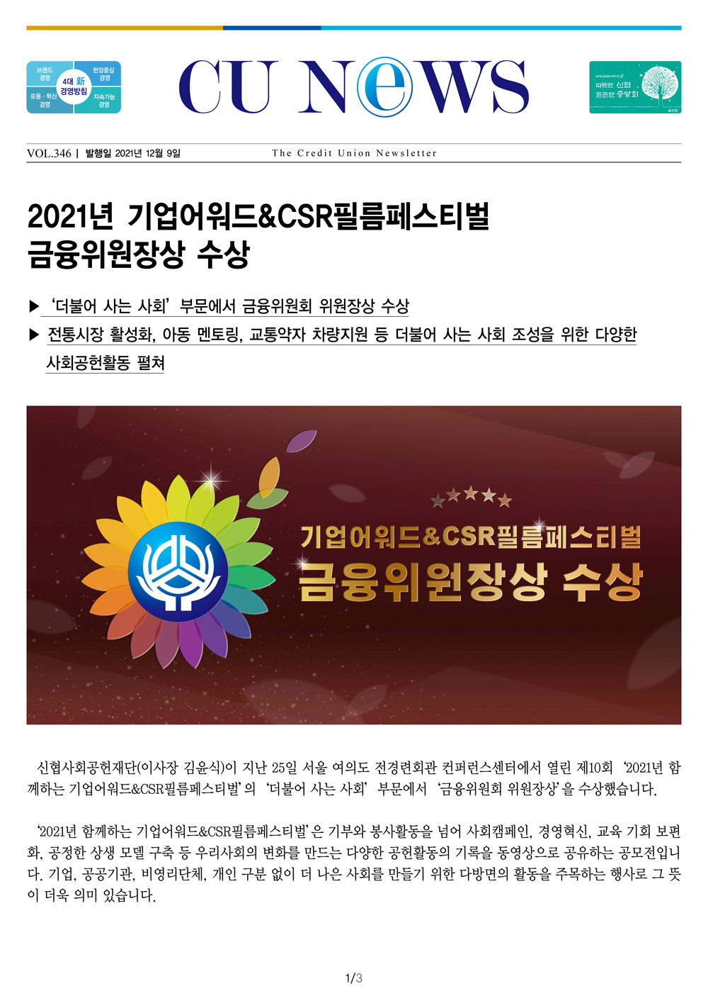 신협사회공헌재단(이사장 김윤식)이 지난 25일 서울 여의도 전경련회관 컨퍼런스센터에서 열린 제 10회 '2021년 함께하는 기업어워드&CSR필름페스티벌'의 '더불어 사는 사회'부문에서 '금융위원회 위원장상'을 수상했습니다.